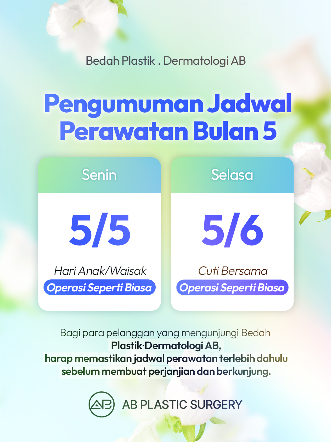 Institusi Medis : AB Plastic Surgery Gedung BLOCK 77 Lantai 2~4, 17, Seocho-daero 77-gil, Seocho-gu, Seoul, Korea (Jalur No.2, Stasiun Gangnam, Pintu Keluar No.10)