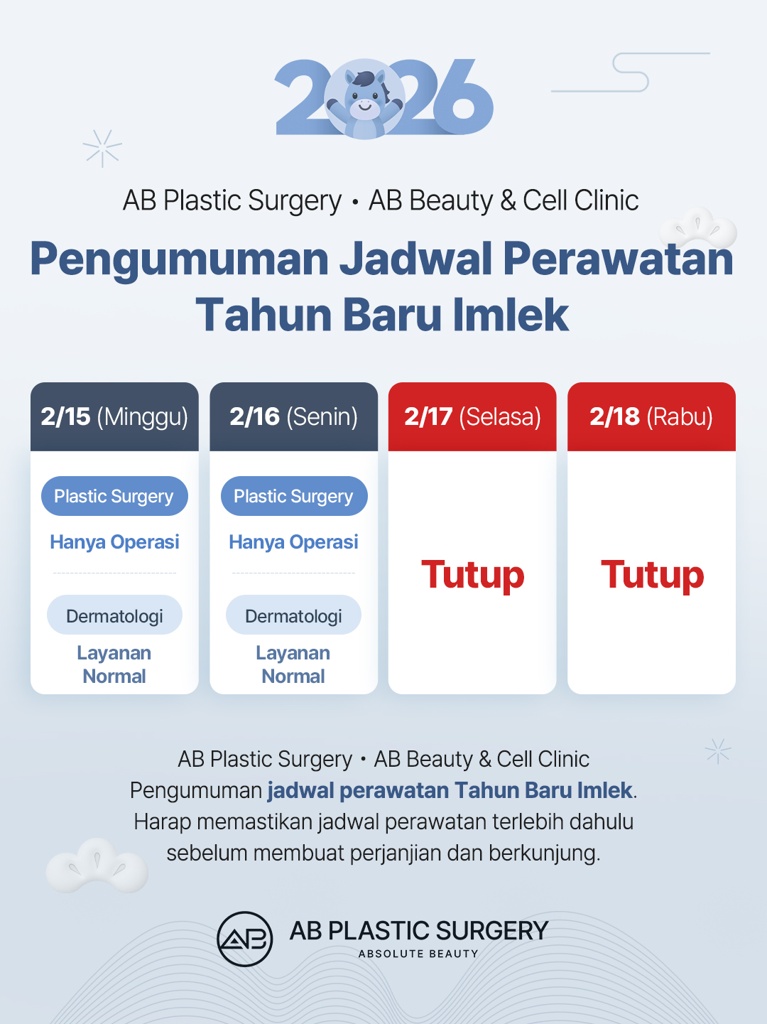 AB Plastic Surgery tutup pada tanggal 17 & 18 Februari 2026 dan