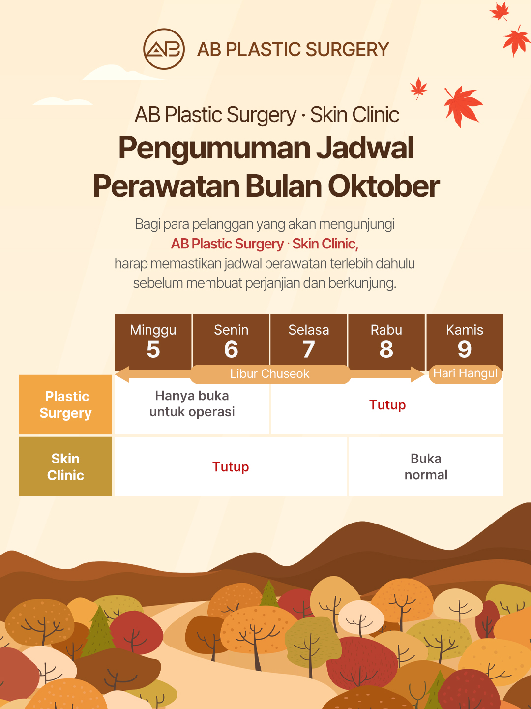 Institusi Medis : AB Plastic Surgery Gedung BLOCK 77 Lantai 2~4, 17, Seocho-daero 77-gil, Seocho-gu, Seoul, Korea (Jalur No.2, Stasiun Gangnam, Pintu Keluar No.10)