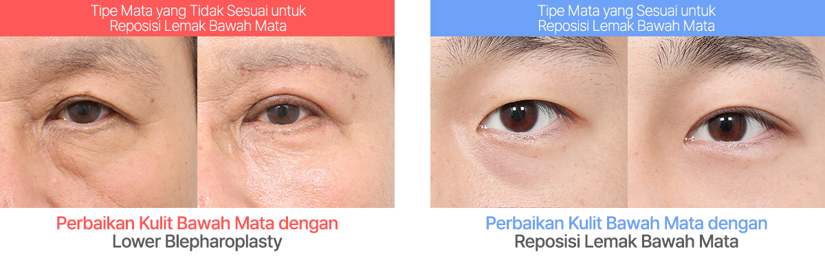 Meskipun kedua prosedur ini sama-sama menangani kulit dan otot bawah mata, tujuan dan proses operasinya berbeda. Secara umum, lower blepharoplasty direkomendasikan bagi pasien yang memiliki kulit bawah mata yang kendur, berkerut, dan lemak bawah mata yang menonjol sementara, reposisi lemak bawah mata lebih cocok untuk pasien yang tidak memiliki kerutan atau kulit kendur dan hanya ada tonjolan lemak di bawah mata. Selain itu, reposisi lemak bawah mata dilakukan tanpa sayatan pada kulit luar, melainkan melalui sayatan kecil di bagian dalam kelopak mata (konjungtiva), setelah itu lemak yang menonjol akan sebagian diambil atau dipindahkan ke area yang cekung. Banyak orang membandingkan prosedur ini dengan lower blepharoplasty, namun reposisi lemak bawah mata umumnya lebih sederhana dan masa pemulihannya lebih cepat. Selain itu, pada reposisi lemak bawah mata, tidak ada sayatan pada kulit luar, sehingga tidak ada bekas luka yang terlihat dari luar.
