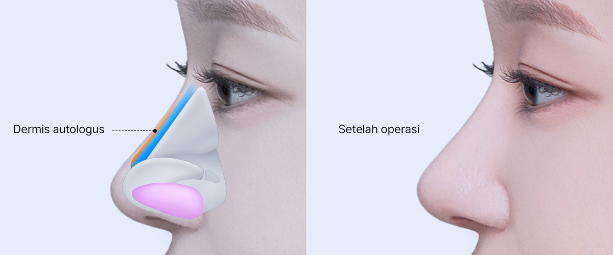 Tentunya ada juga orang yang tidak mau mengurangi tinggi batang hidung hasil operasi sebelumnya. Kembali ke perbandingan dengan balon, jika kita memasukkan satu balon lagi di dalam balon tadi, maka warna balon akan menjadi lebih gelap dan akan lebih sulit melihat bagian dalam balon jika diisi udara. Seperti ini, ada juga solusi di mana kulit di atas implan silikon dipertebal dengan satu lapis dermis autologus. Dengan ini, tekanan langsung di kulit hidung akan berkurang dan mencegah implan silikon menerawang.