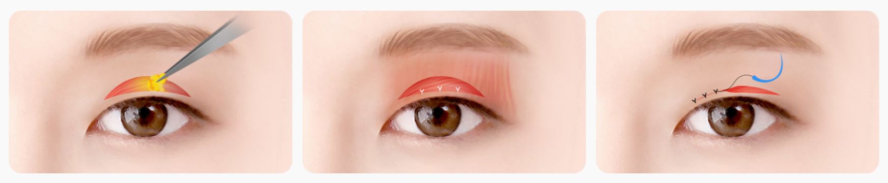 Berbeda dengan operasi tanpa sayatan, operasi dengan menggunakan jahitan memerlukan proses pemulihan tambahan. Mungkin bisa terdapat perbedaan karena dokter bedah dan metode pembedahannya. Namun dalam kasus metode tanpa sayatan yang melibatkan penghilangan lemak, terdapat luka dan jahitan halus setelah operasi. Jika demikian riasan baru dapat diaplikasikan setelah sekitar 5 hari. Epicanthoplasty, Lateral Canthoplasty, Lower Canthoplasty, operasi lipatan kelopak mata ganda dengan sayatan, kelopak mata atas, kelopak mata bawah, dan pengencangan subbrow (alis), merupakan pembedahan yang dilakukan dengan metode sayatan. Jika demikian, riasan dapat dilakukan setelah kurang lebih 7 hari setelah operasi. Untuk relokasi lemak di bawah mata, jahitan dilepas sekitar 3 hingga 7 hari setelah pembedahan, tergantung pada proses pemulihan. Karena itu mencuci muka secara ringan dan riasan kulit dasar dapat dilakukan setelahnya.