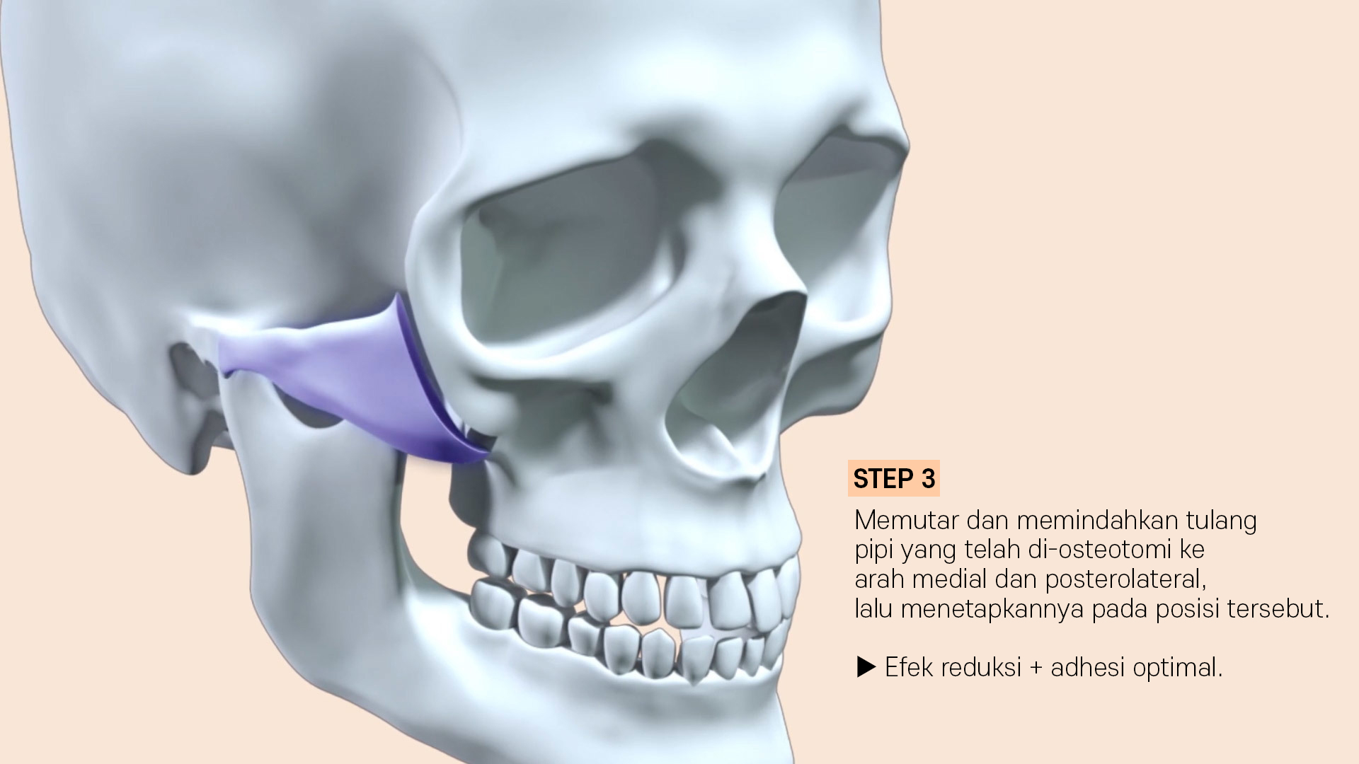 Selain itu, setelah pemotongan tulang (osteotomi), tulang pipi diputar dan dipindahkan ke arah medial dan posterolateral agar bagian yang di osteotomi menyatu dan menempel dengan stabil, serta memberikan efek lifting alami pada jaringan lunak di area pipi.