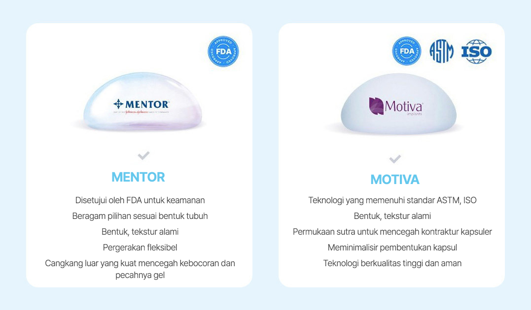 - Mentor: Implan yang terbukti keamanannya melalui sejarah yang panjang. Menyediakan berbagai tipe gel dan lapisan luar sehingga pilihan lebih beragam, juga telah mendapatkan persetujuan dari FDA Amerika Serikat.