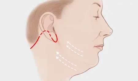 Setelah sayatan minimal dibuat pada bagian belakang telinga mengikuti garis rambut otot platysma dan lapisan lemak akan dipisahkan lalu ditarik, ditetapkan, kulit kendur dipotong, lalu area tersebut akan dijahit.