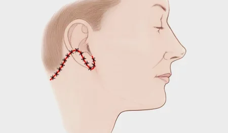 Sayatan dibuat dari posisi yang tidak terlihat pada garis rambut di belakang telinga sehingga luka tidak terlihat mencolok